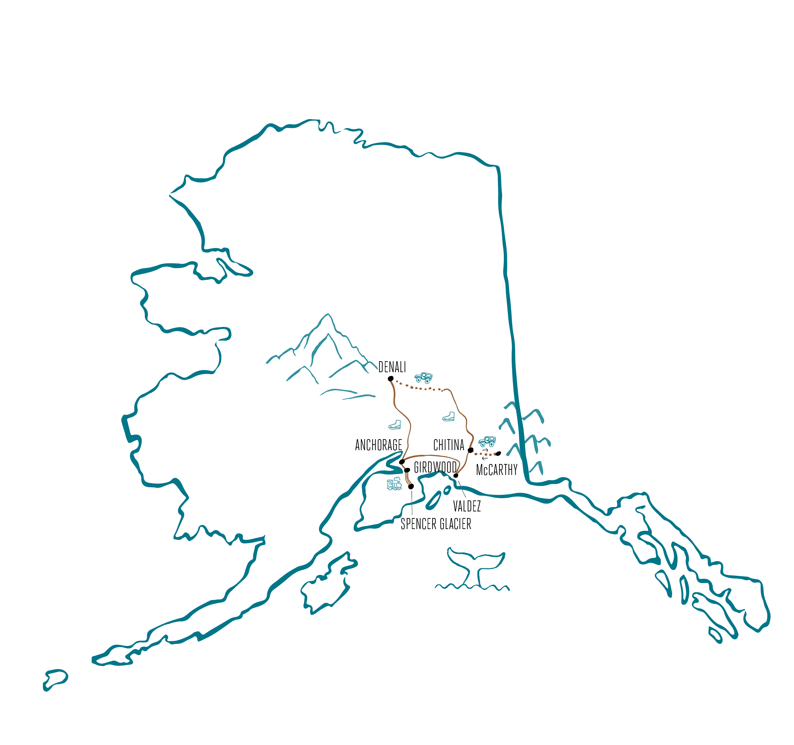 De rondreis 'Alaska Hiker' focust op het vasteland van Alaska, het 'Interior Alaska'. We leggen de nadruk op de gravelroads enerzijds en op hiken anderzijds: op elke interessante wandellocatie voorzien we een extra vrije dag om jullie de tijd te geven de prachtige omgeving zelf te gaan verkennen. Zo verlagen we het reistempo en is er ruimte om de benen te strekken. Bij deze reis horen, als unieke elementen, ook een flightseeing naar Mount Denali en een daguitstap per trein naar de Spencer Glacier. Een unieke afsluiter, want deze gletsjers is enkel per trein bereikbaar.